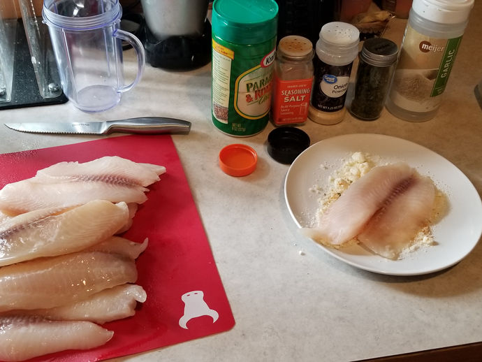 Tilapia frozen or fresh (thawed out) Parmesan cheese (Freshly grated or Kraft) Onion Powder Dried Parsley Any other seasonings you'd...